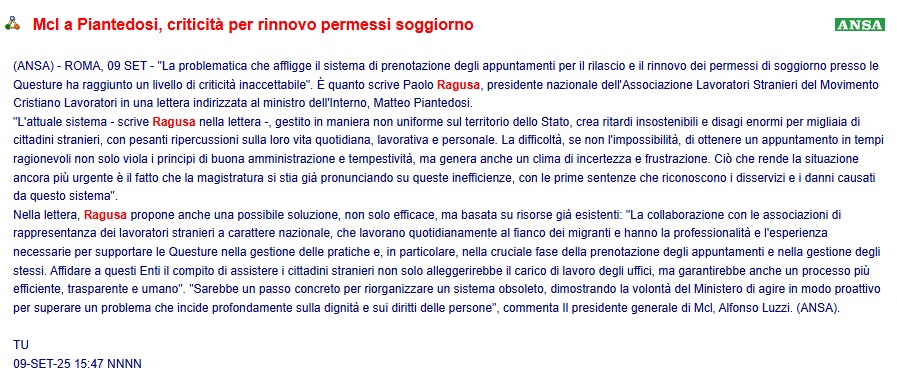 Questo articolo contiene rassegna stampa su: Migranti, Mcl a Piantedosi sul caos-questure: «Aprite alle associazioni»