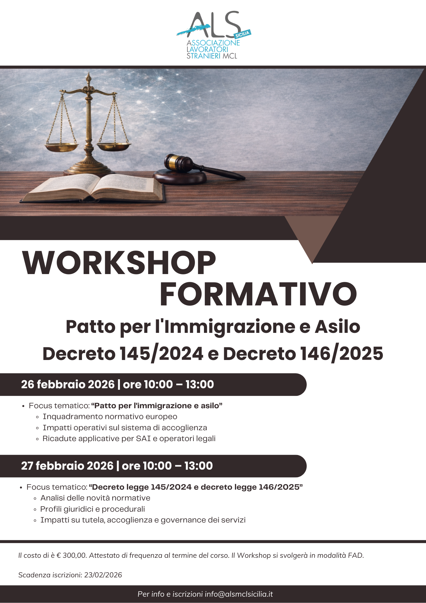 ALS MCL Sicilia organizza un workshop formativo dedicato all’analisi del Patto per l’Immigrazione e l’Asilo e delle disposizioni introdotte dal Decreto Legge 145/2024 e dal Decreto Legge 146/2025.