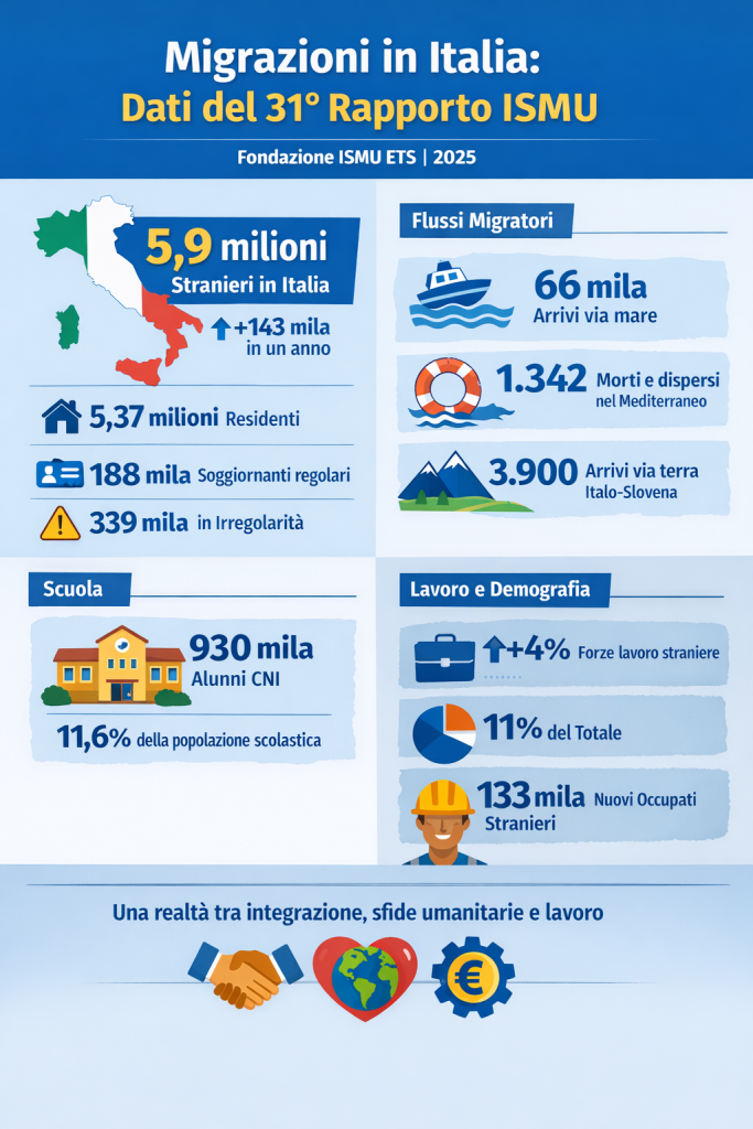 Nel 31° Rapporto sulle Migrazioni, presentato oggi a Milano, Fondazione ISMU ETS, al 1° gennaio 2025, in Italia sono presenti 5 milioni e 898 mila stranieri, con un incremento di 143mila unità rispetto all’anno precedente. Crescono i residenti, che raggiungono quota 5 milioni e 371mila, mentre restano sostanzialmente stabili i soggiornanti regolari non iscritti in anagrafe (188mila) e le persone in condizione di irregolarità (339mila).